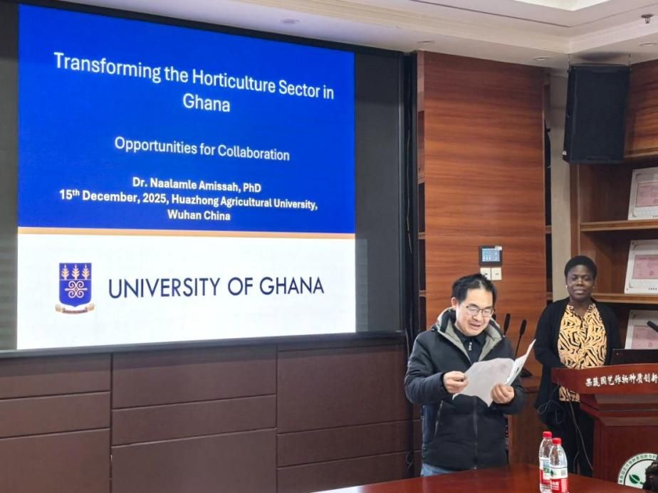2025年12月13-17日,受Norec国际交流项目( The Norwegian Agency for Exchange Cooperation)以及公司黄远老师邀请,加纳大学农公司Freda E. Asem 博士、lamle Amissah 博士来公司开展访谈交流,并在园林南楼206作了题为“Transforming the Horticulture Sector in Ghana”的报告。双方围绕加纳农业发展、本土作物资源利用及国际合作项目展开交流。