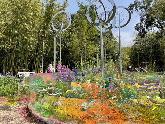 此次营建花园为未来花园设计竞赛大奖作品——《智涟未来》,由伟德bv1946官网风景园林系李岑枫、袁梦楚、张子璇、赵徐颖、刁俊宇五名同学参与设计,夏欣老师指导完成。作品受高频通讯信号波传播、衍射和风力发电启发,11座风车雕塑象征着大湾区11座城市欣欣向荣的生长;扩散交织的炫彩亚克力板展现湾区城市间的互联互通,同时配合适时适地的草花,和向上生长的羽扇豆等特色花卉,构成了极具科技感与交互感的蓝紫色花境。