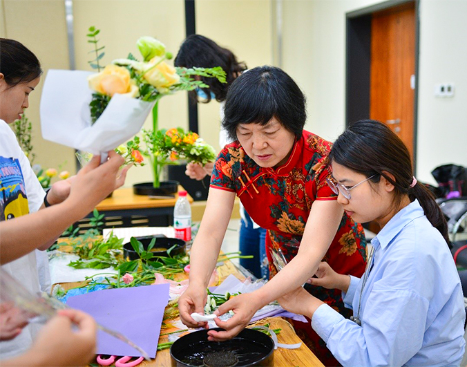 在插花实操环节,王老师和实验室的研究生杨雪、李蕊蕊、朱琳琳和熊康舜以及本科生纪晨怡、宋鸽、宋知熹、岳晨昕等同学为大家示范指导制作各类个性独特的现代花束。最后,老师和研究生们与参与活动的学员们针对各自的实操作品进行了讲评、讨论并进行作品展示。花木小草,蕴涵课程思政,风吹麦浪,体现人文情怀。两院师生在插花实践过与交流展示中一同感悟着插花的文化内涵与创作技艺。