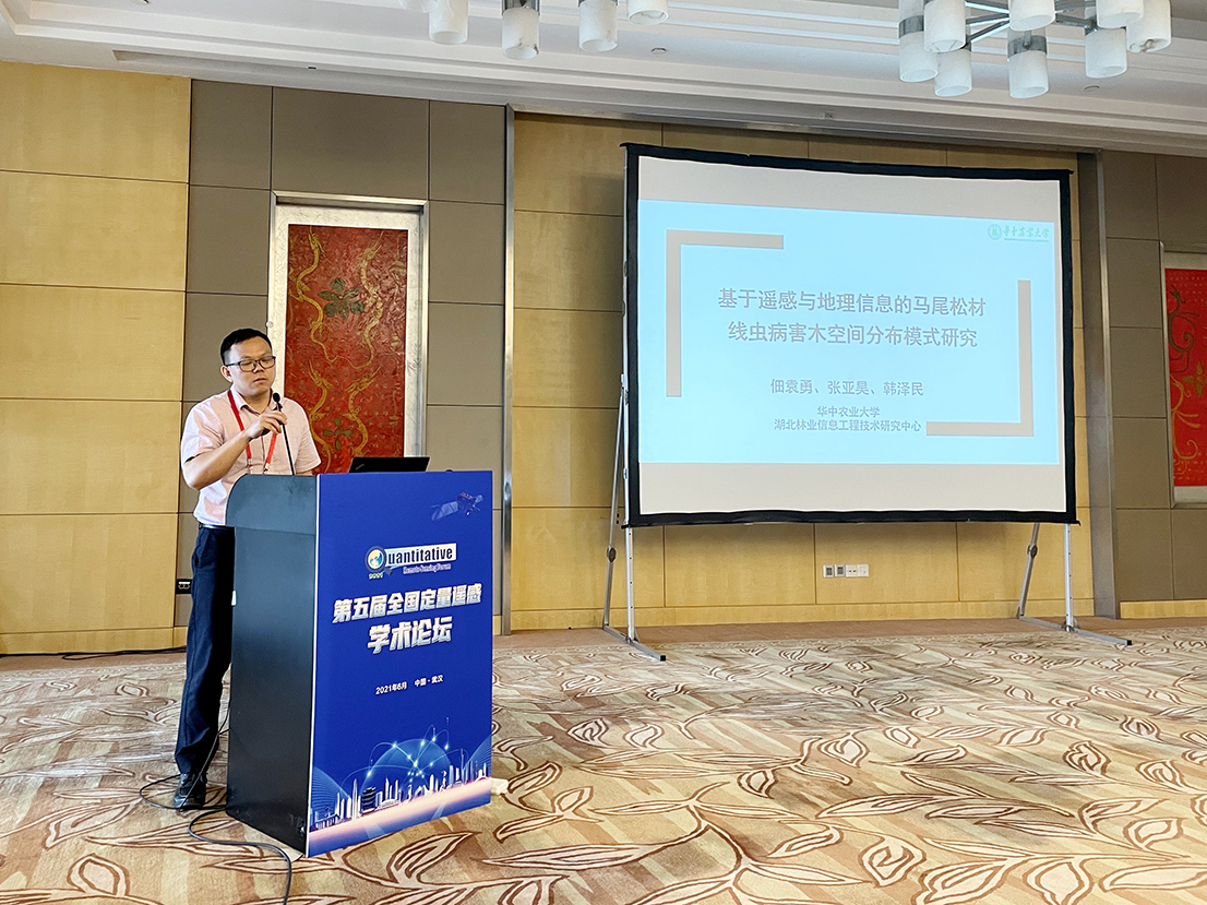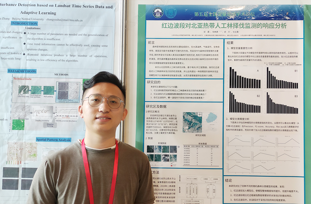 本届论坛共开设了26个分会场和一个海报展览区,公司资源与环境公司孟冉教授与公司佃袁勇副教授和共同承担了“森林干扰遥感监测与预警“分会场召集与主持工作。该分论坛邀请了北京林业大学黄华国教授、中国林科院庞勇研究员、福建师范大学陆灯盛教授、西南林业大学寇卫利教授等国内外知名学者做了精彩报告。清华大学、南京大学、华中师范大学、安徽大学、西南林业大学、南京林业大学、内蒙古工业大学等大学参加该分论坛,针对森林虫害、火灾、采伐等扰动,围绕遥感技术提取扰动信息、评估生物量变化等方面做了精彩报告。佃袁勇与孟冉老师还针对森林病虫害遥感监测做了“基于遥感与地理信息的马尾松材线虫病害木空间分布模式研究”、“融合光谱和时序特征的南方松树甲虫(SouthernPineBeetle)虫害探测模型研究”的专题报告。佃袁勇老师的林业遥感课题组硕士研究生胡磊、胡月、张亚昊、刘晓阳也参加了此次论坛,并制作了题为“红边波段对北亚热带人工林择伐监测的响应分析”的海报展示。