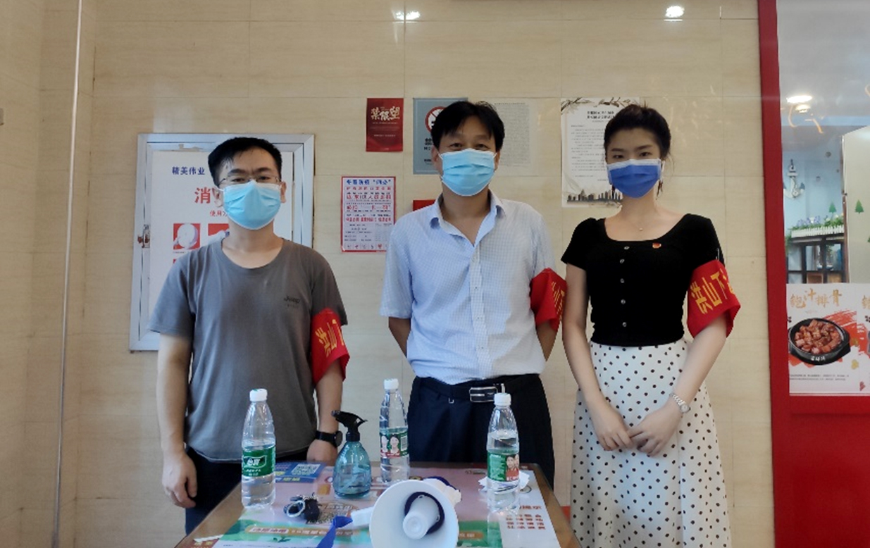 教师党员刘文平、万正杰与员工党员沈玥在美食城执勤(周长剑 摄)