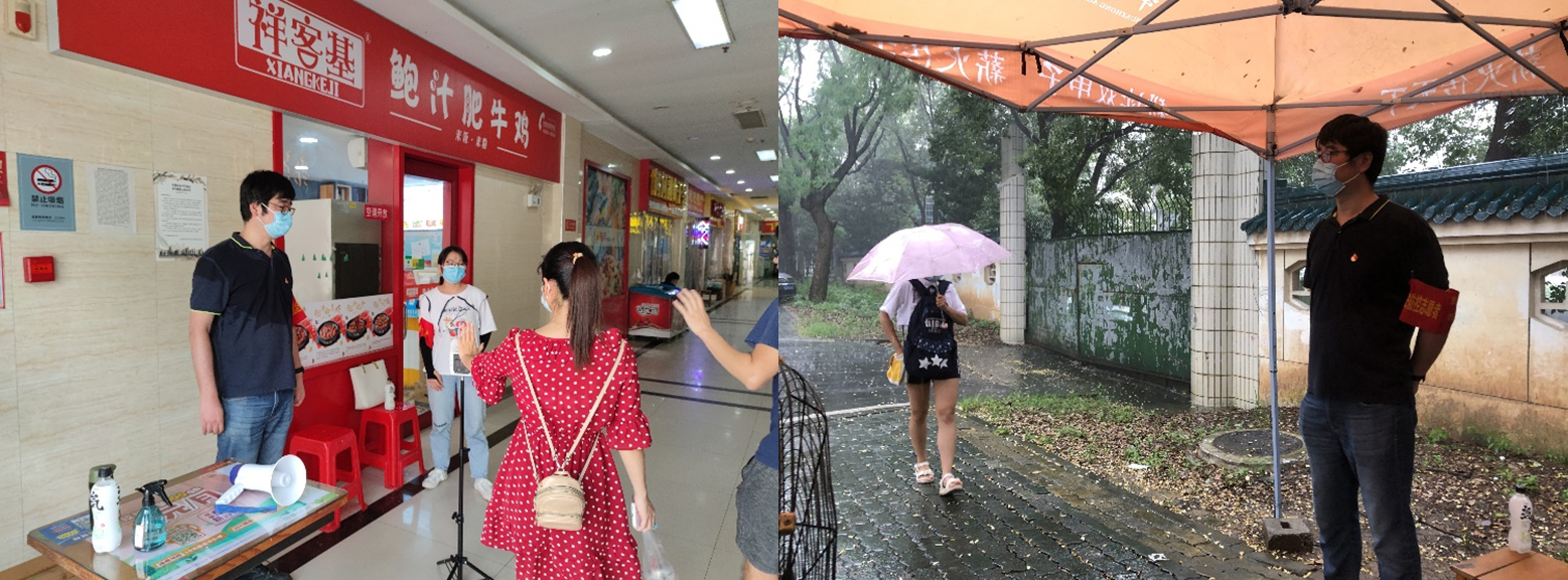 伴随着淅淅沥沥的小雨,教师党员腾明君、员工党员李楚婷和员工党员韩福踏上了前往步行街的路。由于天气原因,美食城来往的客人不是很多,进出次数最多的是外卖小哥,尽管全身湿透,外卖小哥仍然一次次重复测着体温。滕明君老师从到达岗位之后就再也没有停下,交接、指挥、测量体温,汗水浸湿了他的上衣,他只是笑了笑,表示没有问题。