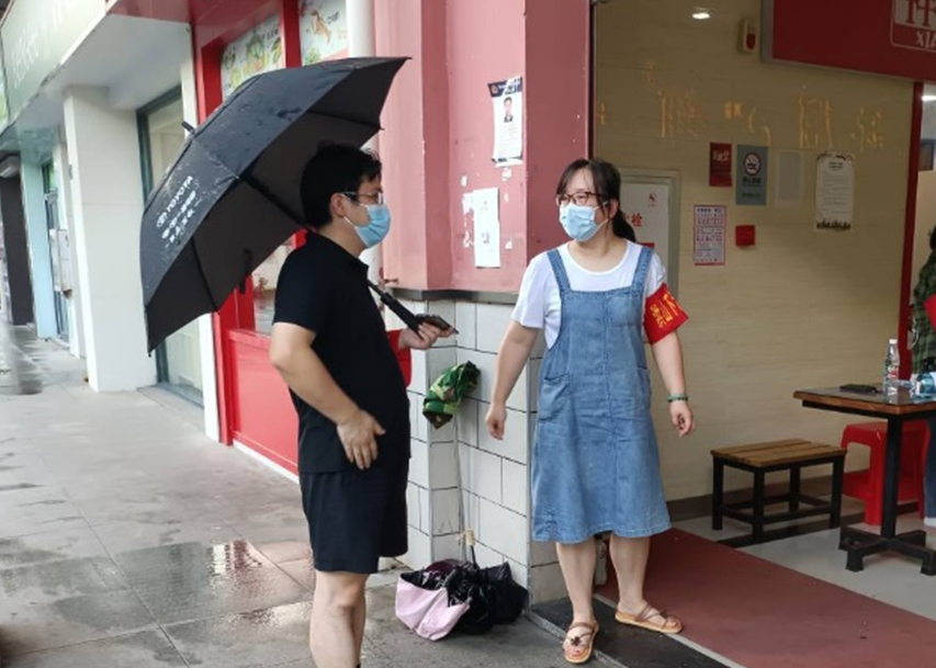 步行街的入口人来人往,多数行人都佩戴好口罩,主动测量体温,他们的理解与配合给予了在雨天坚守岗位的志愿者们温暖。党委副书记蔡江一边安排工作,一边叮嘱志愿者们:不端架子、沉下身子,不起冲突、热情服务,不马虎大意、做好个人防护,彰显下沉党员良好形象。