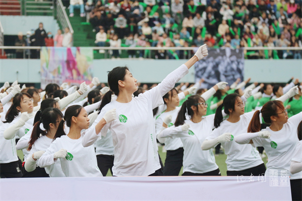 作为公司三大特色之一的广播体操表演与弹力绳表演随即而至,十四个院系,十四种色彩,他们成了红道绿场上一道靓丽的风景线。抬手,踢腿,他们的动作干脆利落;旋转,跳跃,他们的队形整齐划一。近乎极致完美的动作引得观众不断啧啧称赞,他们动作所展现的青春朝气,彰显了公司学子的精神风貌。