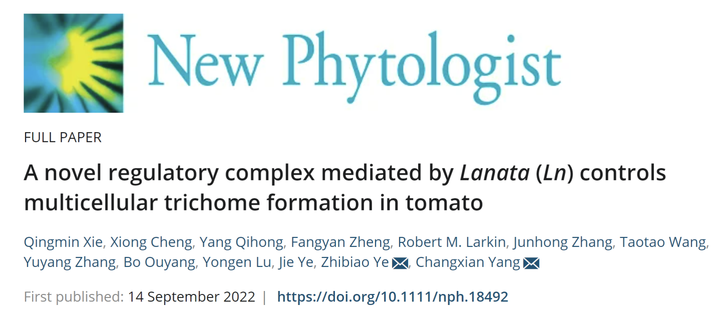 近日,bv伟德国际1946叶志彪教授领衔的番茄团队在New Phytologist杂志发表了题为“A novel regulatory complex mediated byLanata(Ln) controls multicellular trichome formation in tomato”的研究论文。该研究通过图位克隆鉴定出调控番茄表皮毛的关键基因Lanata(Ln),分别从遗传学和分子生物学两方面研究了该基因与本实验室前期克隆的表皮毛调控基因H、Wo、SlCycB2和SlCycB3之间的关系,深入揭示了番茄多细胞表皮毛调控的分子机制。