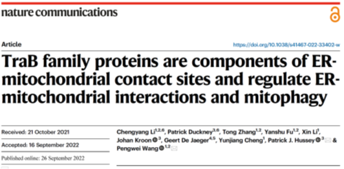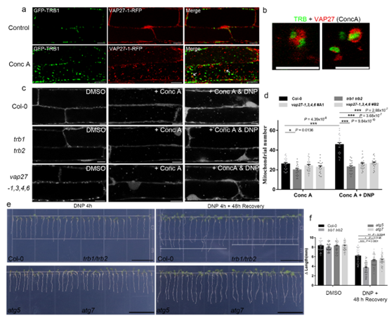 近日,bv伟德国际1946园艺教育部重点实验室、湖北洪山实验室王鹏蔚教授联合英国杜伦大学Patrick J Hussey教授实验室在Nature Communications发表题为TraB family proteins are components of the ER-Mitochondrial contact sites and regulate ER-Mitochondrial interactions and mitophagy的研究论文(图1)。该研究解析了一种新型的EMCS复合体,包括线粒体外膜蛋白TRB1,TRB2和内质网膜蛋白VAP27-1。TRB与VAP27相互作用,调节线粒体与内质网的连接、线粒体形态与功能。TraB家族有三种亚型,即TRB1, TRB2,和TRB3;其中TRB1的线粒体定位在拟南芥、柑橘等高等植物中十分保守。拟南芥trb1/trb2双突变体表现出线粒体形态异常、淀粉积累强烈和能量代谢受损,说明这些蛋白质对正常的线粒体功能至关重要(图2)。此外,TRB1和TRB2蛋白也与ATG8相互作用,以调节线粒体自噬。在正常生长条件下,在Col-0和trb1/trb2中发现液泡内的线粒体数量相似,但是当这些植物遭受线粒体胁迫时,两种突变体中线粒体自噬的效率均显著的受到了抑制,胞质内去极化线粒体数量增多,液泡内线粒体积累的数量减少,胁迫后植物的恢复受到显著干扰(图3)。拟南芥vap27多突变体也有类似的表型,因此推测,TRB1调节线粒体自噬和内质网-线粒体相互作用是两个密切相关的过程,而TraB家族蛋白具有双重作用,其一是真核生物EMCS复合体的组成部分,其二可调节内质网线粒体相互作用以及线粒体自噬。