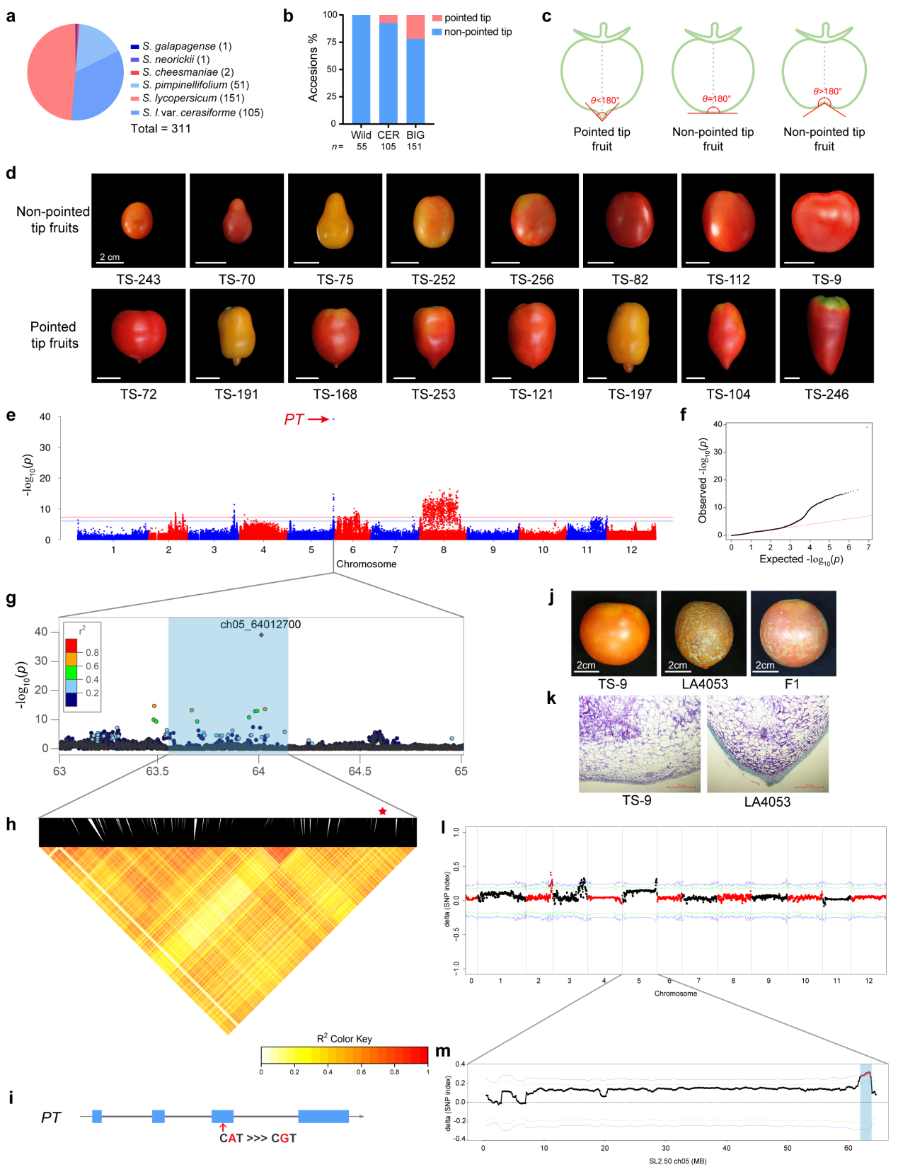 本研究通过对包含311份材料群体的全基因组关联分析以及F2群体的连锁分析鉴定到控制番茄果实远端形态(果尖)基因POINTED TIP(PT),发现Lead SNP位于一个编码C2H2型的锌指蛋白转录因子内部,该SNP的变异导致PT锌指蛋白保守域内保守氨基酸的变异,使得其C2H2保守域的数目由三个变为两个,我们将这两种等位基因分别命名为PTH和PTR。