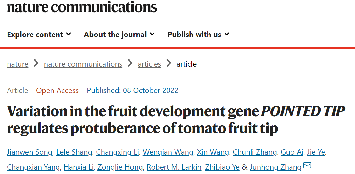 2022年10月8日,Nature Communications杂志在线发表了bv伟德国际1946园艺植物生物学教育部重点实验室番茄团队题为"Variation in the fruit development genePOINTED TIPregulates protuberance oftomato fruit tip"的研究论文,该研究克隆鉴定了番茄果实(果尖)发育基因POINTED TIP(PT),揭示了该基因控制番茄果实远端形态的遗传基础及分子机理,为番茄果实远端形态的遗传改良提供了重要的理论基础和基因资源。