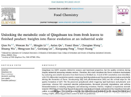 湖北日报农村版讯(记者彭翠楠、通讯员但唐静)近日,bv伟德国际1946茶叶加工与生物技术课题组在国际食品化学顶级期刊《Food Chemistry》(食品化学)上发表最新研究成果,首次在工业化生产规模下系统揭示了赤壁青砖茶从鲜叶到成品茶风味与色泽形成的内在机制,可推动赤壁青砖茶生产从“经验驱动”向“数据驱动”转型。