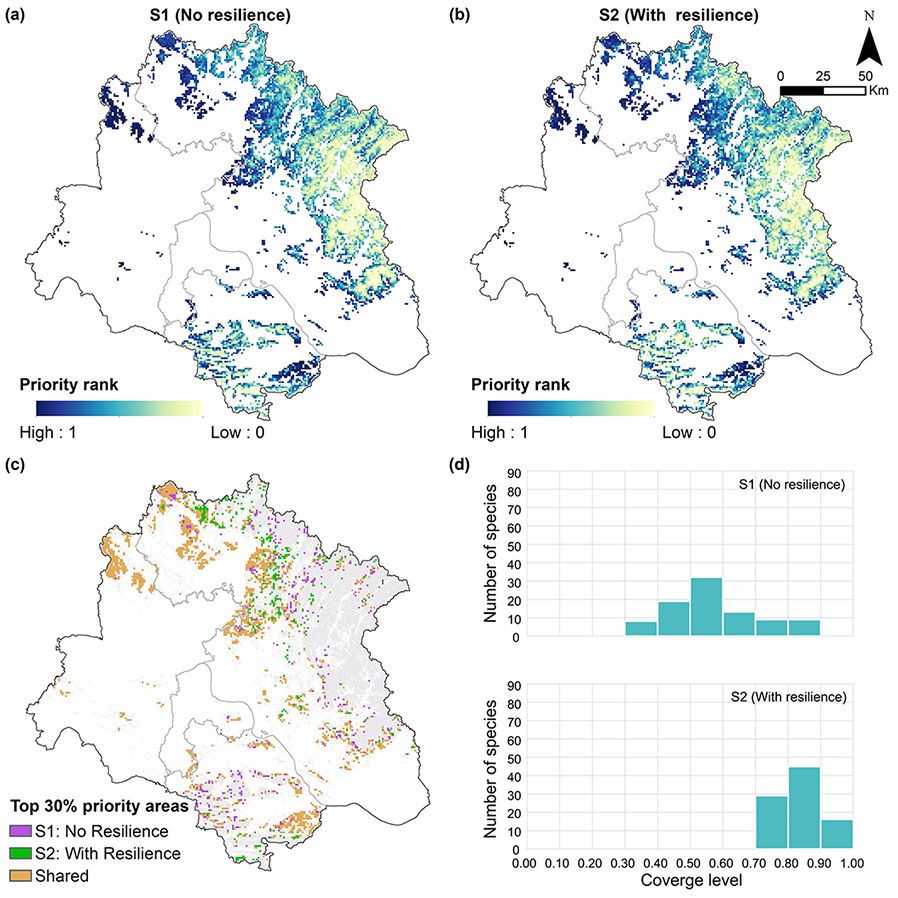 研究以武汉都市圈核心区(CWMA)为例验证了方法框架的可行性,并设置了是否整合韧性的两种情景进行比较。结果显示,前30%的空间优先保护区覆盖总面积1742.3 km²的森林。约有20%的区域在两种情景间发生转移:情景1特有的前30%优先区(图2c 紫色部分)分布较为零散,而情景2特有的优先区(图2c绿色部分)则集中于黄冈北部,该区域森林韧性相对较低,表明韧性的纳入显著改变了优先保护区的空间格局。同时,纳入韧性指标显著提升了大多数物种的保护覆盖率。