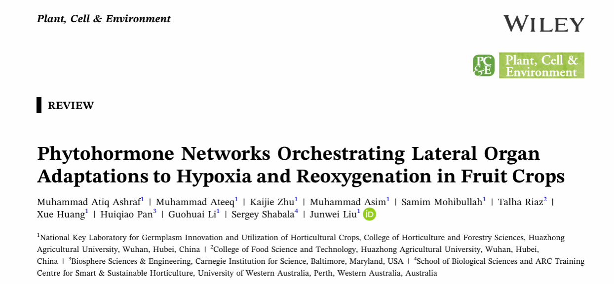 随着全球极端气候事件频发,水涝胁迫已成为制约果树产业可持续发展的关键非生物逆境之一。与一年生作物不同,果树作为多年生木本植物,器官受损后恢复缓慢,且水淹过程中伴随的“低氧-复氧”循环会引发更为复杂的次生损伤。近日,伟德bv1946官网桃栽培生理与生态课题组在植物学领域知名期刊Plant, Cell & Environment上在线发表了题为“Phytohormone networks orchestrating lateral organ adaptations to hypoxia and reoxygenation in fruit crops”的综述论文。该文系统阐述了果树在低氧及复氧过程中,如何通过激素互作网络精密调控侧生器官(如不定根、通气组织、茎干伸长)的可塑性适应,为果树抗涝育种与栽培管理提供了新的理论框架和策略方向。
