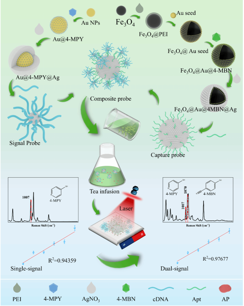 该研究以茶叶中农残啶虫脒为研究对象,联用便携式拉曼光谱与生物适配体技术创新性的制备了一种具有高效磁性的双SERS信号(表面增强拉曼光谱)适配体传感器,并以此构建了一种能够在茶叶复杂基质中实现啶虫脒农药分子特异性捕获、富集分离和SERS信号比率快速检测的方法。其中,捕获探针由嵌入SERS标记分子(4-MBN)的磁性核壳材料与适配体结合而成;信号探针则由嵌入另一种SERS标记分子(4-MPY)的金银核壳纳米材料与cDNA结合而成。两者通过碱基互补配对原则杂交,形成完整的复合探针。当检测体系中存在啶虫脒时,其分子会被核酸适配体特异性结合,从而导致复合探针发生解离。随后,利用磁性分离技术将解离的组分分开。此过程使得溶液中两种标记分子4-MBN与4-MPY的SERS信号强度比值,随啶虫脒浓度的变化而呈现规律性变化,以此实现定量检测。在最优条件下,该策略能够实现茶叶中啶虫脒农药在10-4 mol/L-10-10 mol/L浓度范围内的快速检测,检测限可达4.75 μg/kg,远低于中国和欧盟规定的最大限量标准(0.05 mg/kg)。在实际茶样检测中,该策略的检测回收率在82.41%- 94.17%之间,与传统HPLC检测方法的相对误差在3.23%- 12.51%范围内,具有较高的检测准确性和特异性。检测时间可以控制在10 min以内,大大提高了检测效率。该研究后续将进行参数的进一步优化,开发便携式快速检测产品与设备,以期为茶叶安全生产提供技术支持。