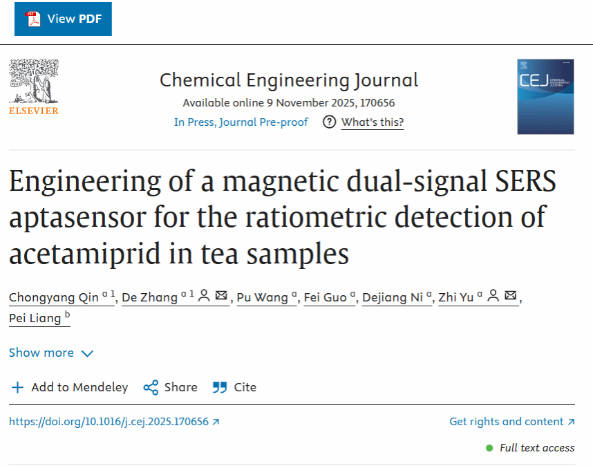 近日,伟德bv1946官网、果蔬园艺作物种质创新与利用全国重点实验室倪德江教授团队张德副研究员和余志副教授在国际学术期刊Chemical Engineering Journal上在线发表了题为“Engineering of a magnetic dual-signal SERS aptasensor for the ratiometric detection of acetamiprid in tea samples”的研究论文。本研究提出了一种可以在茶叶复杂基质中高效磁性富集、快速、特异性检测啶茶叶中虫脒农药残留的有效策略,为保障茶叶质量安全奠定了研究基础。