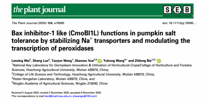 近日,伟德bv1946官网、果蔬园艺作物种质创新与利用全国重点实验室别之龙团队在The Plant Journal上在线发表了题为“Bax inhibitor-1 like (CmoBI1L) functions in pumpkin salt tolerance by stabilizing Na+ transporters and modulating the transcription of peroxidases”的研究论文。该研究揭示了南瓜中一个新的耐盐基因CmoBI1L,通过调控Na+转运蛋白及抗氧化酶介导南瓜耐盐性的分子机制。