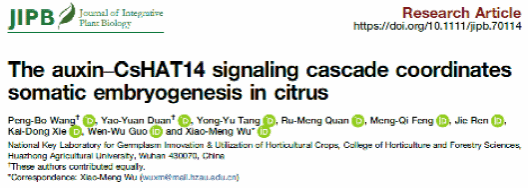 近日,JIPB在线发表了bv伟德国际1946果蔬园艺作物种质创新与利用全国重点实验室/湖北洪山实验室郭文武教授/伍小萌教授团队题为“The auxin- CsHAT14 signaling cascade coordinates somatic embryogenesis in citrus”的研究论文。该研究提出了CsIAA4-CsARF5-CsHAT14-CsDOF3.4信号级联调控柑橘体细胞胚发生的分子机制,为柑橘体细胞胚发生调控通路提供了新见解。