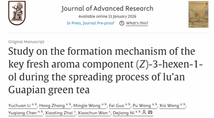 近日,伟德bv1946官网、果蔬园艺作物种质创新与利用全国重点实验室茶叶加工与功能化学团队在Journal of Advanced Research上在线发表了题为“Study on the formation mechanism of the key fresh aroma component (Z)-3-hexen-1-ol during the spreading process of lu’an Guapian green tea”的研究论文。该研究首次证明了CsERF105-CsADH1模块在鲜叶摊放过程中响应失水胁迫调控顺-3-己烯醇的生物合成。创新性地将茶叶风味化学与分子生物学相结合,这一交叉领域的探索有助于深入揭示茶叶采后香气品质的调控机制,也为非生物胁迫下茶叶品质的形成提供了全新的视角。