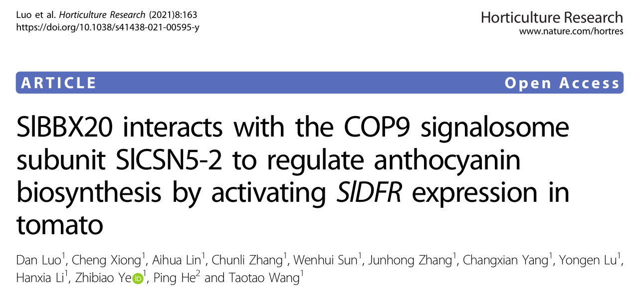 近日,公司番茄团队发现超量表达SlBBX20 后花青素积累增多,提出了SlBBX20-SlCSN5-2互作调控番茄叶片花青素积累的模型,该研究揭示了光诱导花青素生物合成的一个新的调控途径。相关研究成果发表在国际学术期刊Horticulture Research上。