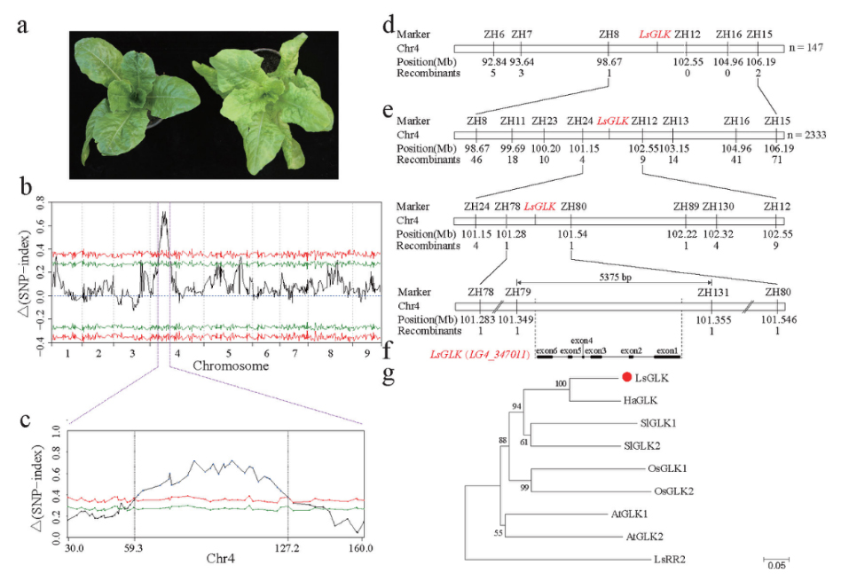 通过全基因组关联分析,该研究鉴定到一个与光合色素(叶绿素a、叶绿素b、叶绿素a+b、类胡萝卜素以及总光合色素)含量变异显著相关的主效QTL;进一步通过构建双亲群体,利用BSR-Seq和图位克隆的策略,将此位点精细定位到4号染色体5,375 bp区段内,并获得了一个编码GARP类型转录因子的基因LsGLK。转基因互补验证了该基因对光合色素含量的调控作用。在浅绿植株中,该基因终止密码子后10 bp处插入了一个长度为7,434 bp的CACTA类转座子,在转座子后又有第3-6四个外显子的复制;此外,CACTA类转座子的插入导致LsGLK基因发生可变剪接,大部分转录本丢失了第六个外显子,只有6%的转录本未改变编码区并可翻译为功能蛋白。与深绿植株相比,浅绿植株中转座子的插入没有改变GLK基因的表达量;然而,由于可变剪接,产生了大量的非功能性转录本,相当于敲低了LsGLK基因的表达,导致植株叶浅绿色性状。
