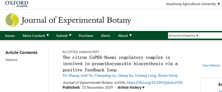 近日,Journal of Experimental Botany在线发表了园艺植物生物学教育部重点实验室题为“The citrus CsPH4-Noemi regulatory complex is involved in proanthocyanidin biosynthesis via a positive feedback loop”的研究论文。该研究报道了柑橘CsPH4-Noemi复合体以反馈调节环的方式调节原花青素的生物合成,为后续柑橘果实品质改良提供了良好的理论基础。
