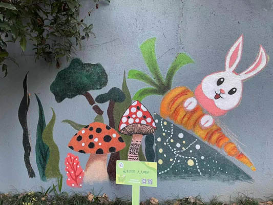 随后,志愿者调和携带的丙烯颜料,同时开始了上色阶段。在两位研究生的带领指导下,园艺主题墙面内容可爱、进展顺利,在绘画过程中吸引了小朋友们的目光,将原本不起眼的园艺角变成了儿童游戏空间,极受欢迎的卡通兔子形象也引得小朋友争相与之合照。梧桐树和电线杆在志愿者的笔下显得生动有趣,可爱的形象借助原有纹理巧妙上彩,显得十分新颖自然。消防安全和垃圾分类墙面则分别采用了卡通和纪实的风格,与场地原有的消防器械、环卫设施相呼应,使墙绘与社区环境融为一体。