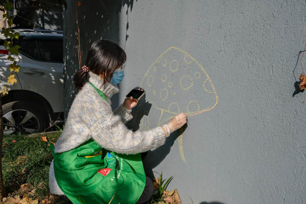志愿者以小组为单位分别负责消防安全、垃圾分类及园艺主题墙面绘制,另有两组负责梧桐树创意美化和园艺主题电线杆绘画。迎接着清晨的阳光,志愿者们用粉笔在墙面、梧桐树及电线杆上绘制底图,让一幅幅可爱的卡通形象和自然景物线稿落户在社区之中。