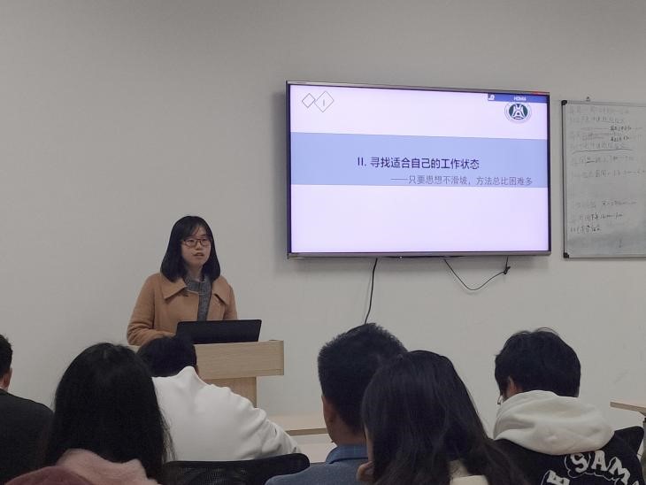 本次党日活动邀请到了支部指导老师傅小鹏同志和优秀博士研究生李润慧同志。李润慧同志以“潜心耕耘,静待花开”为主题,从“选择读博的心路历程”和“寻找适合自己的工作状态”两个方面进行了分享。活动中李润慧同志在谈到自己如何下定决心读博时讲到,应拿出新时代青年的魄力,多尝试,撸起袖子加油干;对于未来工作规划,她表示应结合自身情况,选择工作领域,不怕失败,选择一条适合自己的路。