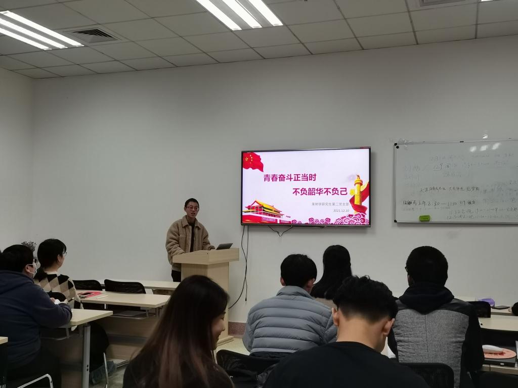 青春,不仅是党旗下立下的铮铮誓言,更是平凡生活中的默默付出,是激情拼搏中的累累硕果,也是不断成长的自我蜕变。为进一步弘扬优秀党员的奋斗精神,引导大家向优秀党员同志看齐,果树学研究生第二党支部于12月10日在园林南楼521会议室举办12月党日活动。本次活动邀请了潘佳佳、冯壹梅和廖炜三位优秀员工代表,以“青春奋斗正当时,不负韶华不负己”为主题,分享他们的青春奋斗故事。支部指导老师刘军伟参加活动。