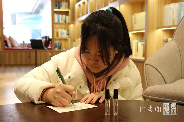 在香水的调制上,志愿者们想法不一。一位来自园林院的员工选用了柠檬精油与香水专用酒精调制香水;一位公管院的员工配制的一瓶香水借鉴了PPT中配方所配,另一瓶则按照自己的想法想搭出神清气爽的感觉。此外,大家还在明信片上写下对考研学长学姐的祝福。这些祝福卡片将与香水一起,由工作人员送给即将考研的学长学姐们。