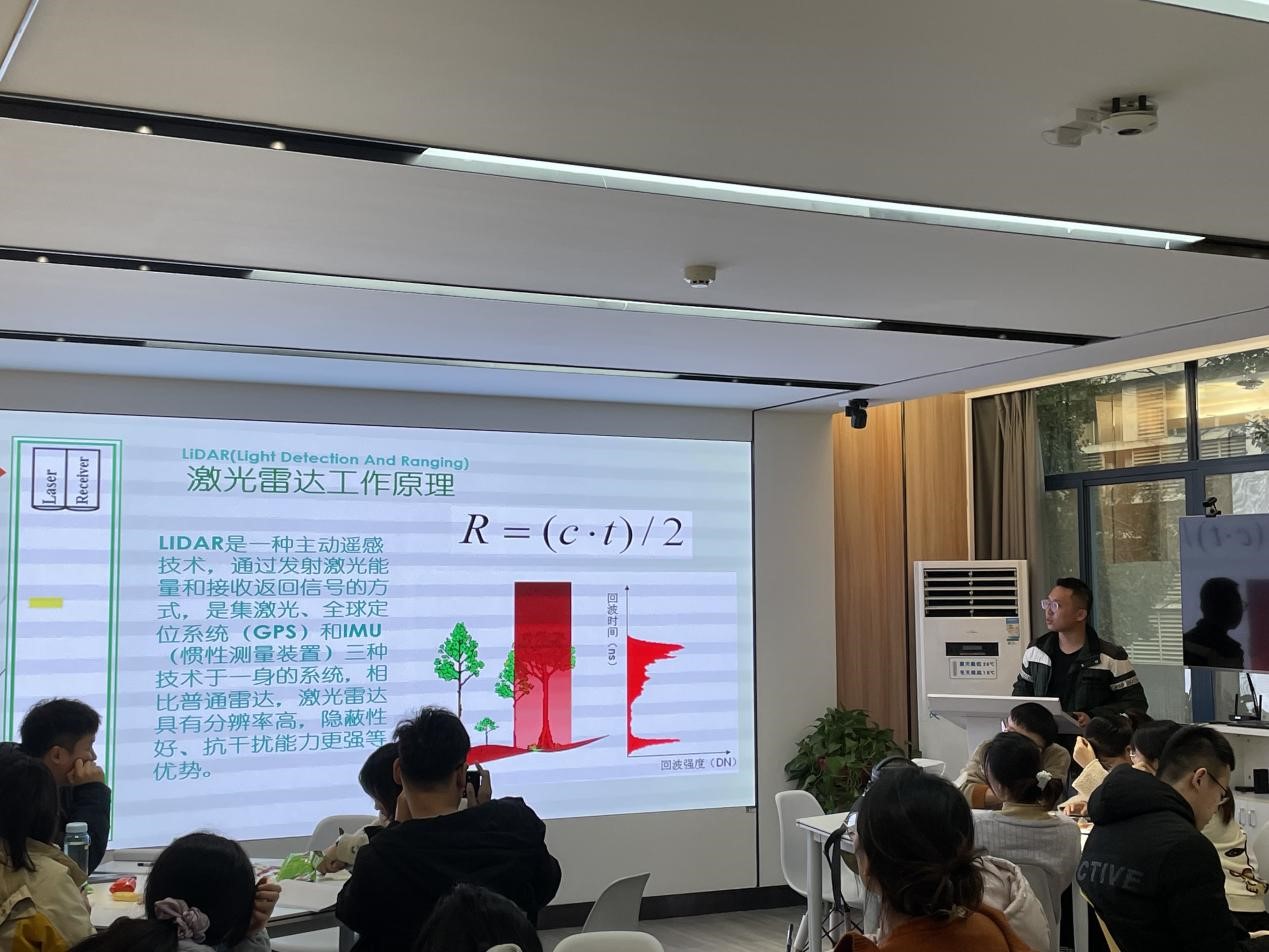 紧接着,胡磊同学介绍了激光雷达技术在遥感领域中的应用,同学们听的传神,现场学习氛围浓厚。胡磊讲到,激光雷达是一种主动遥感技术,是集激光、全球定位系统(GPS)和IMU(惯性测量装置)三种技术于一身的系统,相比普通雷达,激光雷达具有分辨率高,隐蔽性好、抗干扰能力更强等优势。在林业工作过程中,激光雷达可以反演森林参数,准确、高效、快速地获取森林资源相关信息,并及时监测森林资源的动态变化……胡磊总结到,该技术在林业应用中潜力巨大,但面临着成本预算、算法等复杂挑战。