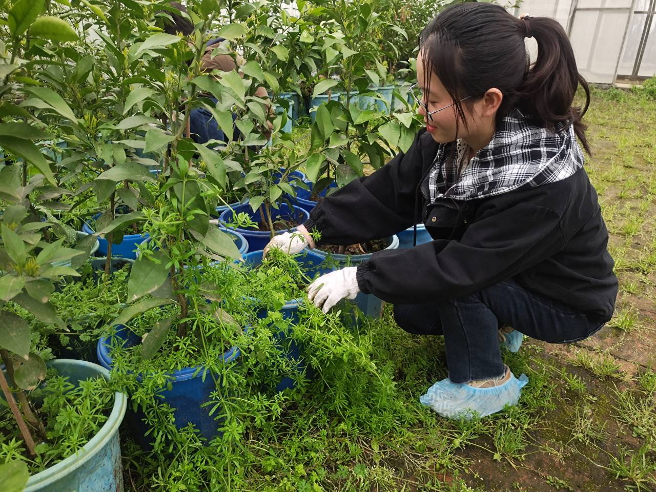 雨水导致地面泥泞,却依旧抵挡不了研究生志愿者对志愿活动的热爱,26日志愿者们在基地大棚内对柑橘材料周围的杂草进行清除,来自20级林学班的林马勇表示:“来到华农一年多,这是我第一次进入柑橘中心实验基地,这次的志愿活动让我对柑橘类植物有了更深刻的认识与了解,切实感受到‘双一流’背景下园艺人才培养的实践,将志愿服务与劳动育人相结合,既能体验劳动的意义和价值,又能获得成就感、自信心。”
