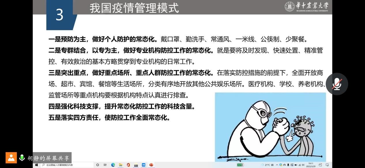 会上,胡静详细介绍了新冠病毒新变异株奥密克戎的相关知识,她表示,虽然奥密克戎致病率低,但传播力快、感染绝对人数大、重症和死亡绝对人数高,且其后遗症多,因此绝不能放松警惕。“我们不能学习西方的与病毒共存策略,”她这样说道,“我国的防控理念是人民至上、生命至上,不会通过被动的免疫来获取人群免疫水平提升。”她提醒同学们要留意群通知,关注公司最新防疫消息,做到“非必要不离汉”。