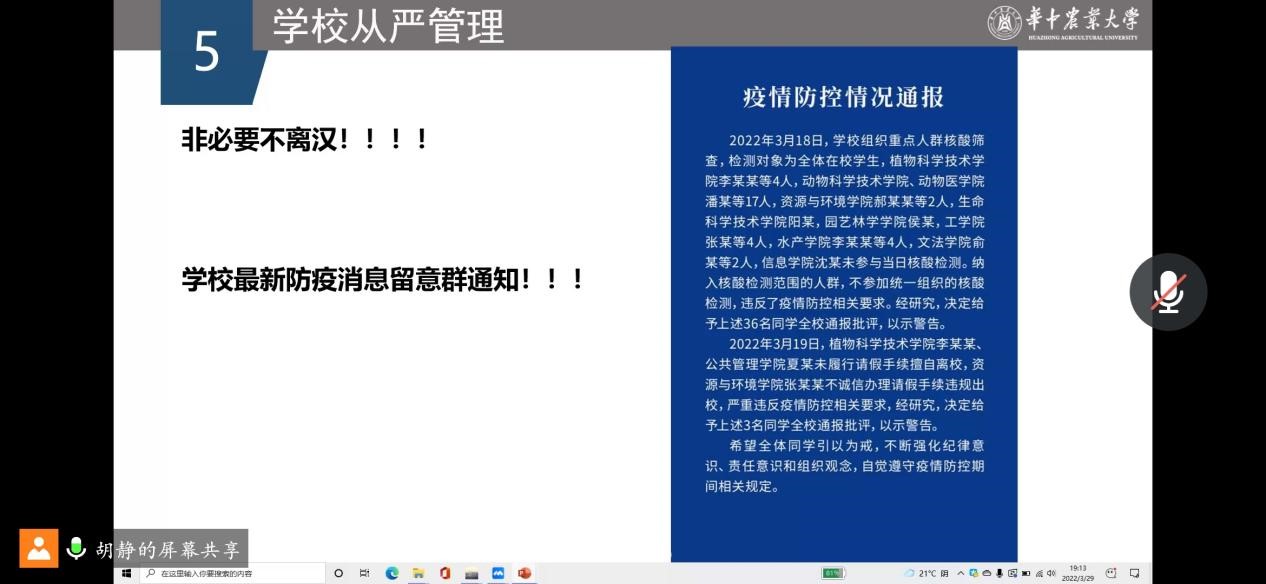 为深化防疫思想,提高对新冠病毒的认识, 3月29日,21级茶学班召开防控疫情线上主题教育班会。21级茶学班全体成员参加此次班会,班会由团支书胡静主持。