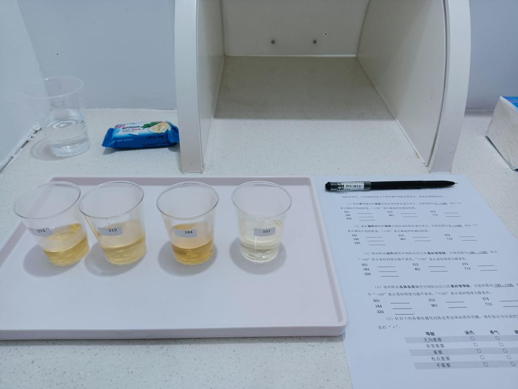 培训完毕后,志愿者们有序进入感官评价室,根据试验指令:每轮评价时,面前有若干个带有编号的陈皮茶样品,依次嗅闻和品尝,分别从香气强度、滋味强度、对汤色属性的喜好度等级、样品总体品质的喜好度等级进行打分,最后针对各感官属性对陈皮茶总体品质的贡献,对各属性对应等级进行选择,以志愿者代入消费者进行一个综合的评价。