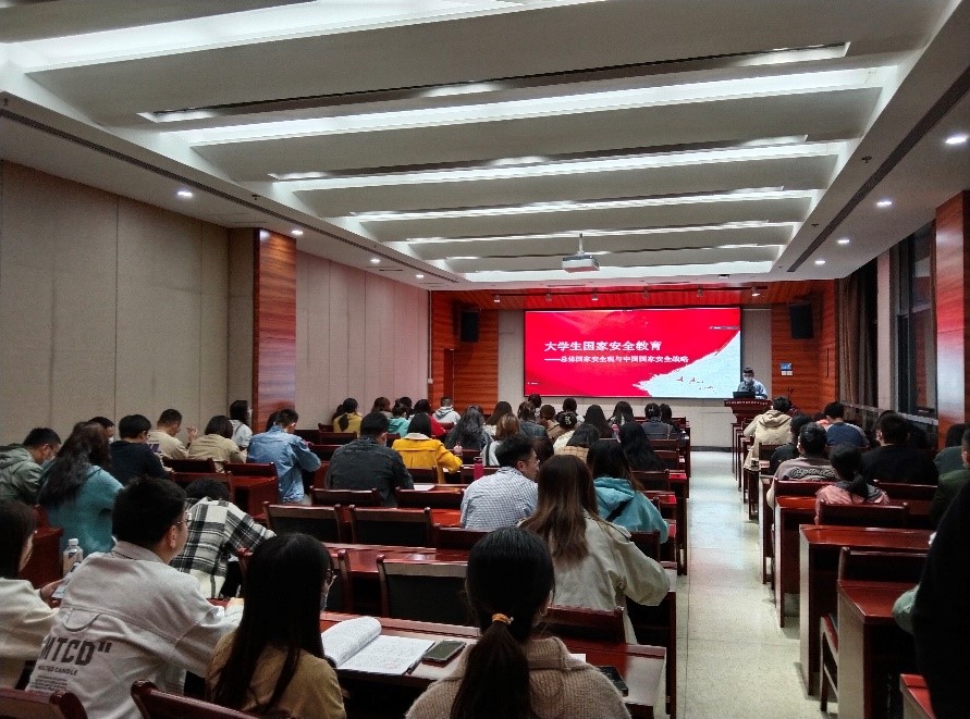 接着,周长剑围绕“新时代国家安全形势研判”、“如何理解国家安全是安邦定国重要基石”、“如何正确理解和把握总体国家安全观”以及“维护重点领域国家安全”等方面进行了详细阐述,展现加强安全教育、打造国家安全治理共同体的重要性。他提醒同学们在网络时代要不信谣不传谣,以国家安全为中心,做一位合法的公民。