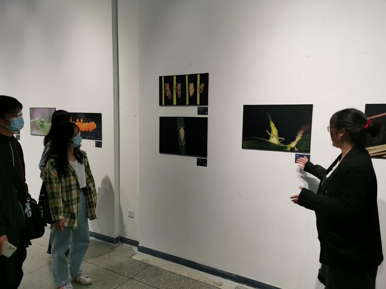在讲解员闵婧同员工动的讲解下,同学们先后参观了“烛引”“耘耔”、“陟遐”、“彰思”四章节,看到了科研实验中的微观摄影照片、学术科研实践中的纪实照片、“狮言诗语”学科语言三行诗还有各个公司具有学科特色的小型主题展。在参观过程中,一张名为《疑惑》的摄影作品吸引了大家的注意,这张照片拍摄的是一只睡眠被打扰的短额负蝗,它睁着大大的眼睛挠着头,神情姿态十分有趣引得大家发笑。