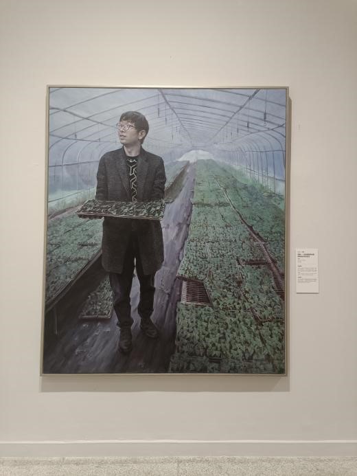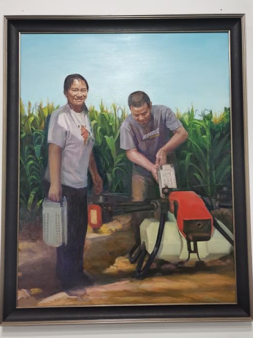 另一幅给人留下深刻印象的作品是《希望的田野》。该作品以本地人文乡情为创作背景,采用现实主义创作手法,表现新时代的农民利用现代科技提升农业生产效率、助力乡村振兴高质量发展的愿望和热情。社会实践团队成员李婧谈到:“习近平总书记指出,中国现代化离不开农业农村现代化,农业农村现代化关键在科技、在人才。作为涉农专业的员工,我们应当增加学科认同感,肩负起兴农报国使命,掌握更多的农业科技知识,用现代科技助力乡村振兴,在‘希望的田野’上无愧于青春,无悔于时代,为实现农业农村现代化矢志奋斗。”