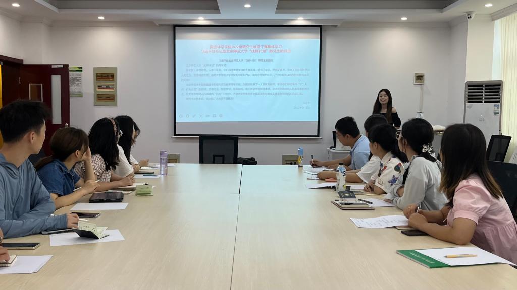在第38个教师节到来之际,习近平总书记9月7日给北京师范大学“优师计划”师范生回信。信中鼓励广大青年要珍惜时光,毕业后到祖国和人民最需要的地方去,努力提升个人能力,以成为让人民满意的“四有”好老师为目标,不断奋进。伟德bv1946官网2022级研究生班级干部认真研读习近平总书记的寄语与嘱托,结合自身学习科研生活,分享讨论心得体会。