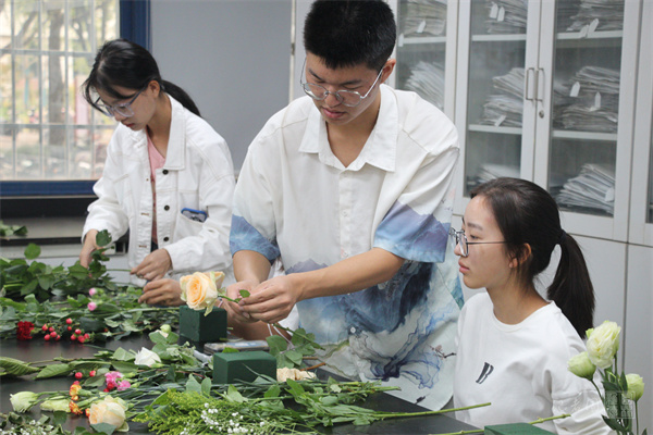 温柔浪漫的月季,纯洁灵动的雏菊,小巧清新的满天星,各色花材铺满桌面。在工作人员的协助下,大家将多种花材修剪、整枝,再根据不同的色彩与形状进行搭配。鲜花与绿叶错落有致、层次分明,一个又一个独具创意的花艺作品跃然呈现。现场气氛热烈,花香四溢,笑语不断。经济与管理公司经济2207班的何海约是第一次参加插花活动,她分享道:“一直觉得插花很有意思,这次活动让我真正体验到了插花的魅力,也提高了自己的动手能力。”外国语公司的刘峥表示:“我感觉插花是一个很有意义的事情,可以把自己的所思所想通过花材的设计表达出来。比如我这次插花的灵感就是‘玫瑰少年’,所以以两朵玫瑰为主体进行了搭配。”