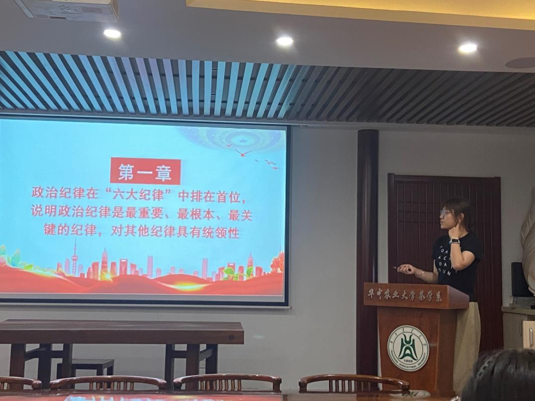 会议伊始,党支部书记郭婧同志以党的“六大纪律”为主题讲授主题党课。她谈到,六大纪律即政治纪律、组织纪律、廉洁纪律、群众纪律、工作纪律、生活纪律,要求党员同志们将“党纪是我们要重点学习把握、逐条对照检查的内容,也是党员干部最坚强的后盾”这一准则牢记于心。她强调,《中国共产党纪律处分条例》从第六章到第十一章,总共106条,要求我们提高自我管理约束,不违规不违纪,同时也是对我们的帮助和保护,使得党员同志们在正确的规范和要求下,不断提升自我,奉献社会。其中,政治纪律在“六大纪律”中排在首位,是最重要、最根本、最关键的纪律。