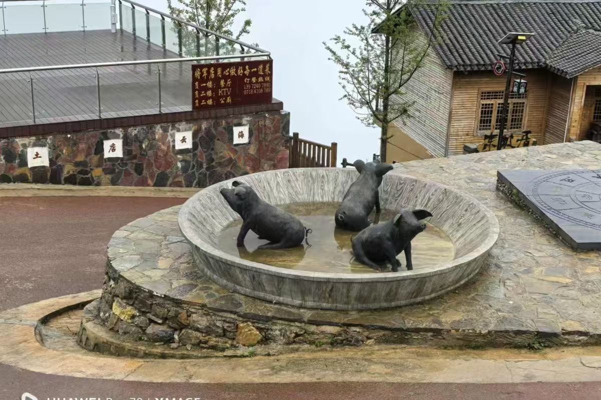 在风景如画的土店子村,一场由传统向现代的华丽转身正悄然上演。驻足于村中的文化广场,两尊栩栩如生、憨态可掬的黑猪雕塑映入眼帘,它们不仅承载着村庄的记忆,更预示着土店子村一条独具特色的致富之路。环绕四周的“猪”元素文化长廊、精致的微景观,以及醒目的“土店年猪”四个大字,共同构成了“土店子八景”之一的年猪文化广场,这里每年都会举办热闹非凡的民俗年猪宴,吸引着远近游客纷至沓来。