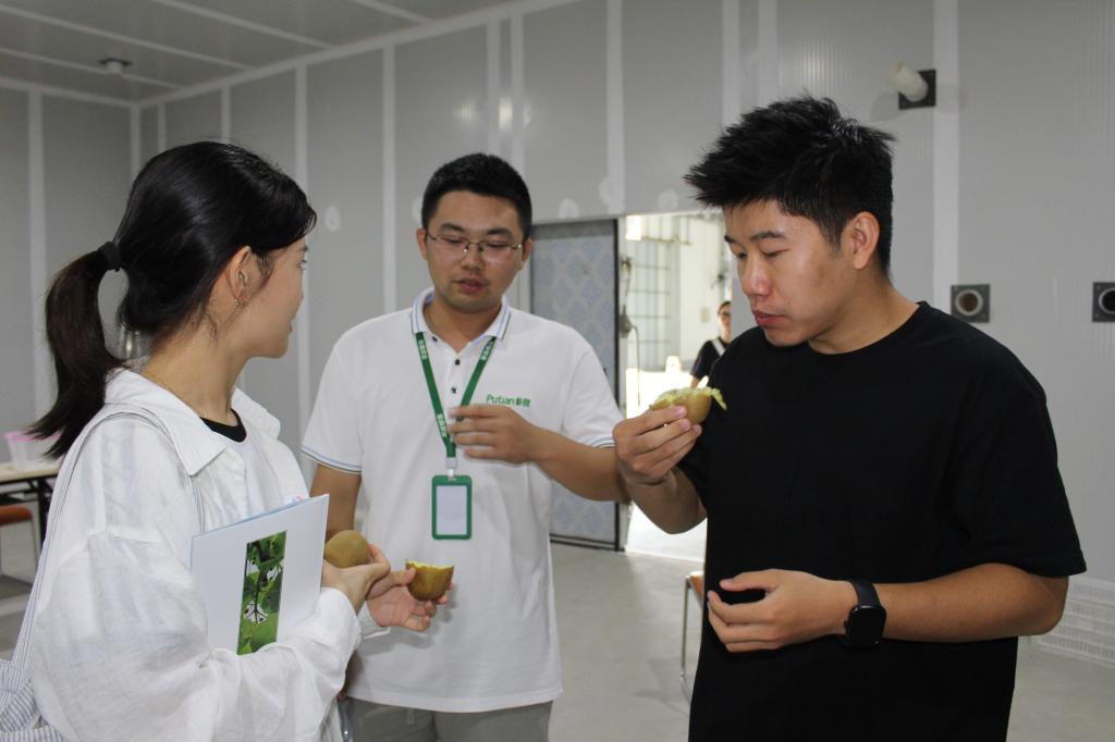 在猕猴桃栽培区,团队成员们亲眼见证了高枝牵引管理方式的优越性。相比传统的T形架,这种管理方式不仅提高了果园的通风性,还显著降低了劳动成本。主栽的朴甜一号和朴甜二号猕猴桃品种各具特色,尤其是朴甜一号作为早熟品种,可将猕猴桃供应时间提前。基地未来将引进更多品种,满足消费市场对绿肉、红肉、红心等猕猴桃的需求。据了解该公司已研发出12种猕猴桃果实加工品,涵盖果品、酒品、食品等多个品类,将一二三产业融合,促进了产业升级与创新、增加了农民收入与就业,同时促进城乡融合发展,缩小城乡差距,助力乡村振兴事业。