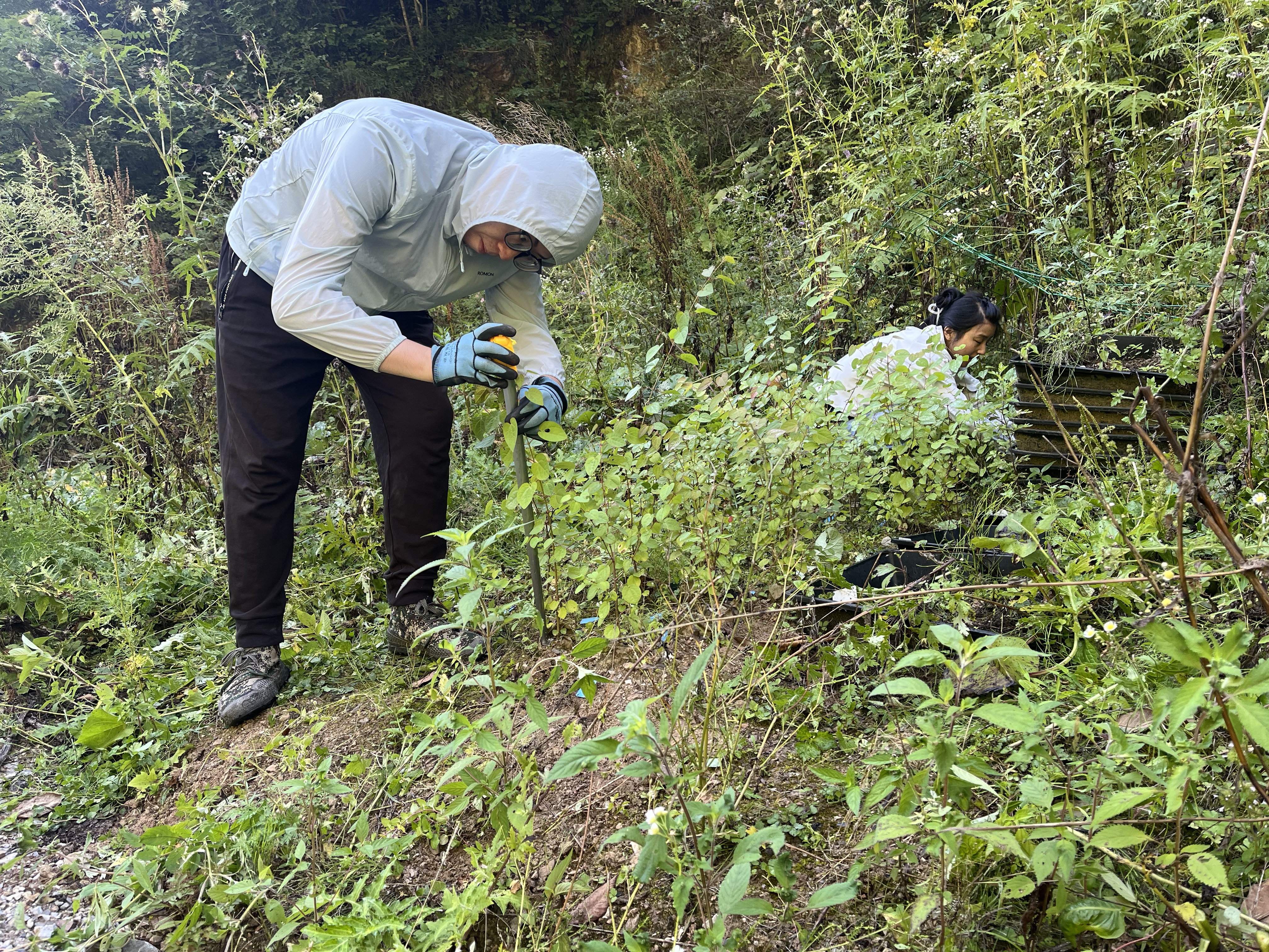 在为期九天的实地研究中,研究团队的四名研究生在孟红杰副教授的指导下,通过对连香树幼苗生长量的测定,了解了其生长情况;测量了连香树种群内个体胸径,并野外采集了连香树叶片,获取了叶片相关性状数据。
