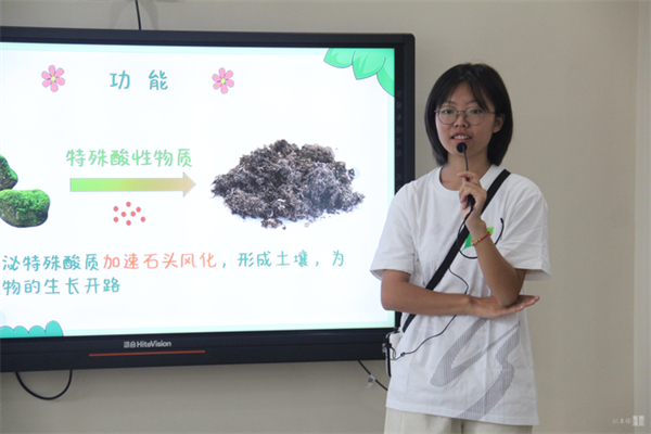 活动伊始,服务队的队员李梓菁首先通过生动有趣的讲解,向孩子们介绍了苔藓植物的奇妙世界。她用通俗易懂的语言,讲述着苔藓植物的特点、生长环境以及独特的生态价值。孩子们瞪着大大的眼睛,充满好奇地聆听着,仿佛迈入一个新颖而神秘的苔藓王国。
