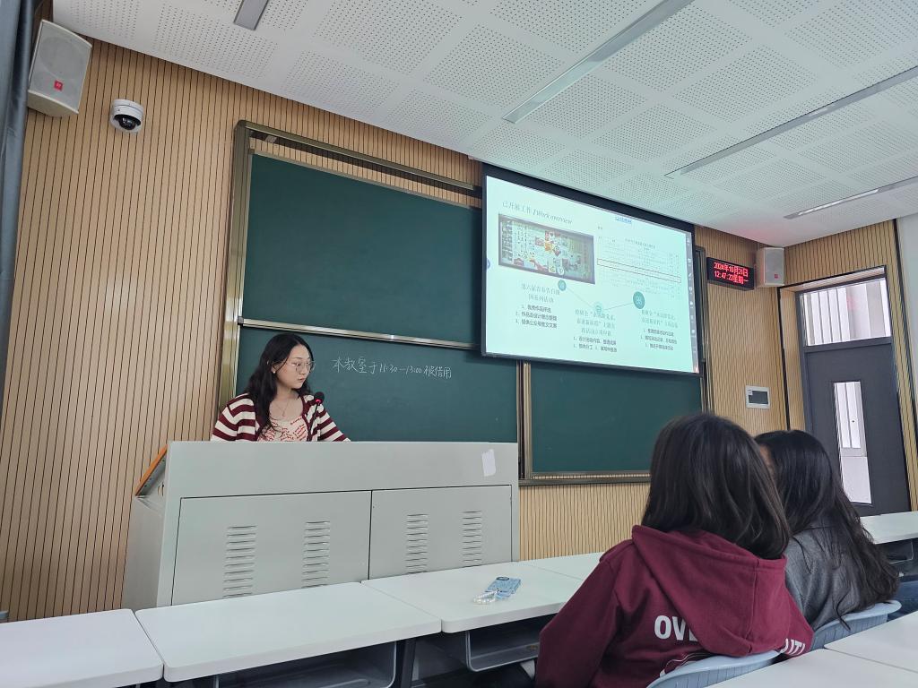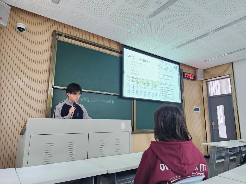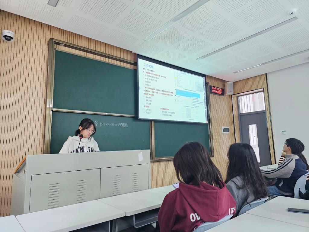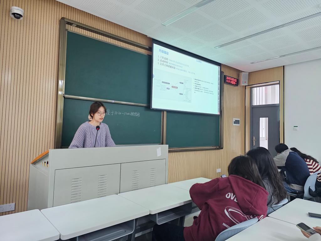 此后,文体部部长赵晨以“部门团队建设”和“近期工作内容”为主要内容,向大家展示了文体部友好活跃的部门氛围以及狮子山新生杯、运动会和运动嘉年华期间活动参与者以及部门成员的风采。最后,新闻宣传部部长伊绘锦以“双向赋能,讲好园林故事”等四个板块,分别讲述了新宣部作为为园林师生发声之桥梁的付出与成就,展示了新宣部通过“狮山园林”公众号作为主要宣传载体,以“两季三节”为主体,以重大校园节庆和贯穿全年的特色文化为辅的宣传内容工作。