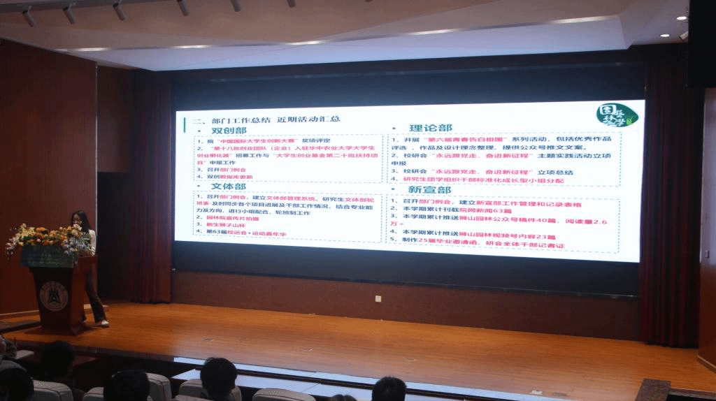 研究生会主席团成员谭灵进行了个人陈述。简述了研究生会管理模式的转变,相较于往年更精简,更深入。此外,谭灵也对研究生会四大部门近期工作进行了总结汇报。
