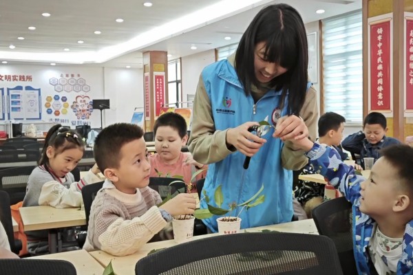 在学习了扦插桂花的方法后,在志愿者的指导下,小朋友们开始亲自动手。志愿者为大家一一分发土培扦插桂花的材料,每位小朋友都跃跃欲试。修剪枝条、杯底打洞、放入蛭石泥土、插入枝条、浇水,一个桂花扦插就做好了。之后蒋玉洁交代:“扦插枝条要放到家中通风散射光的环境,可以放在家里的阳台上,还要避免阳光暴晒,浇水时保持托盘里一直有水就好,等待生根发芽之后就可以移栽了。”小朋友们捧着自己的桂花扦插枝条,亮晶晶的眼神闪着绿色的光。