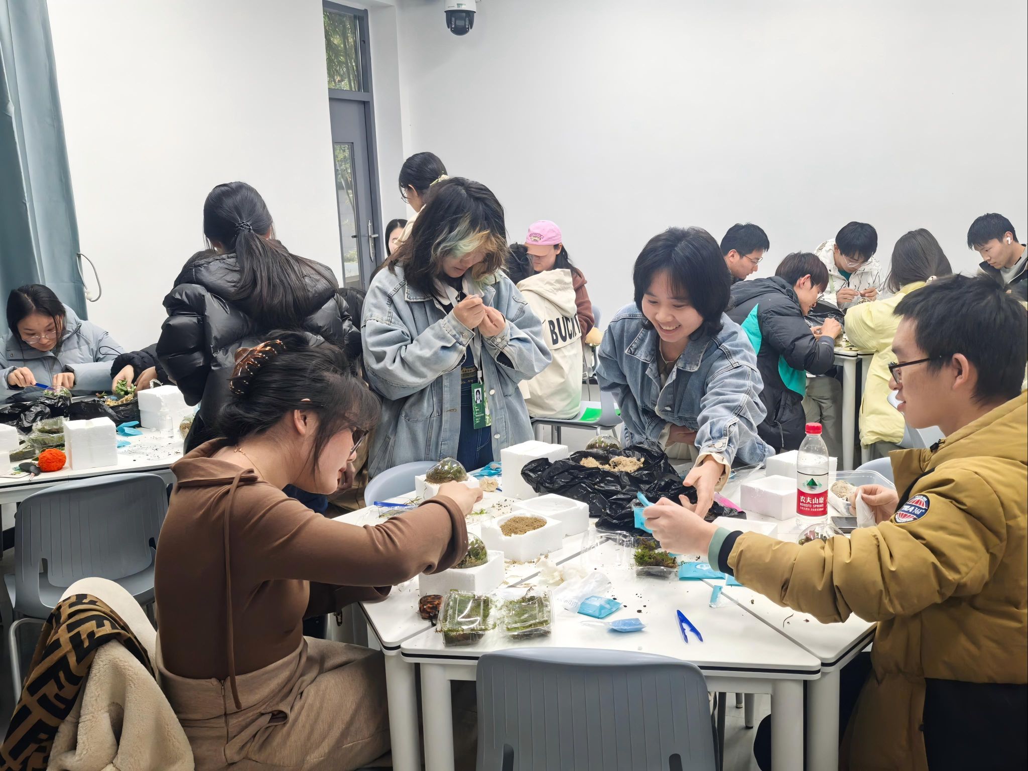 活动的核心之一是生态瓶制作,这一环节不仅让同学们亲手体验了生态构建的过程,更深刻地理解了生态系统的微妙平衡。在科协成员的耐心指导下,同学们将轻石、水苔、种植土、网纹草、苔藓、装饰沙和装饰石等材料巧妙结合,创造出了一个个充满生机的微型生态系统。每位参与者都全身心投入,从挖坑种植到精心装饰,每一步都透露出对自然的敬畏与爱护。