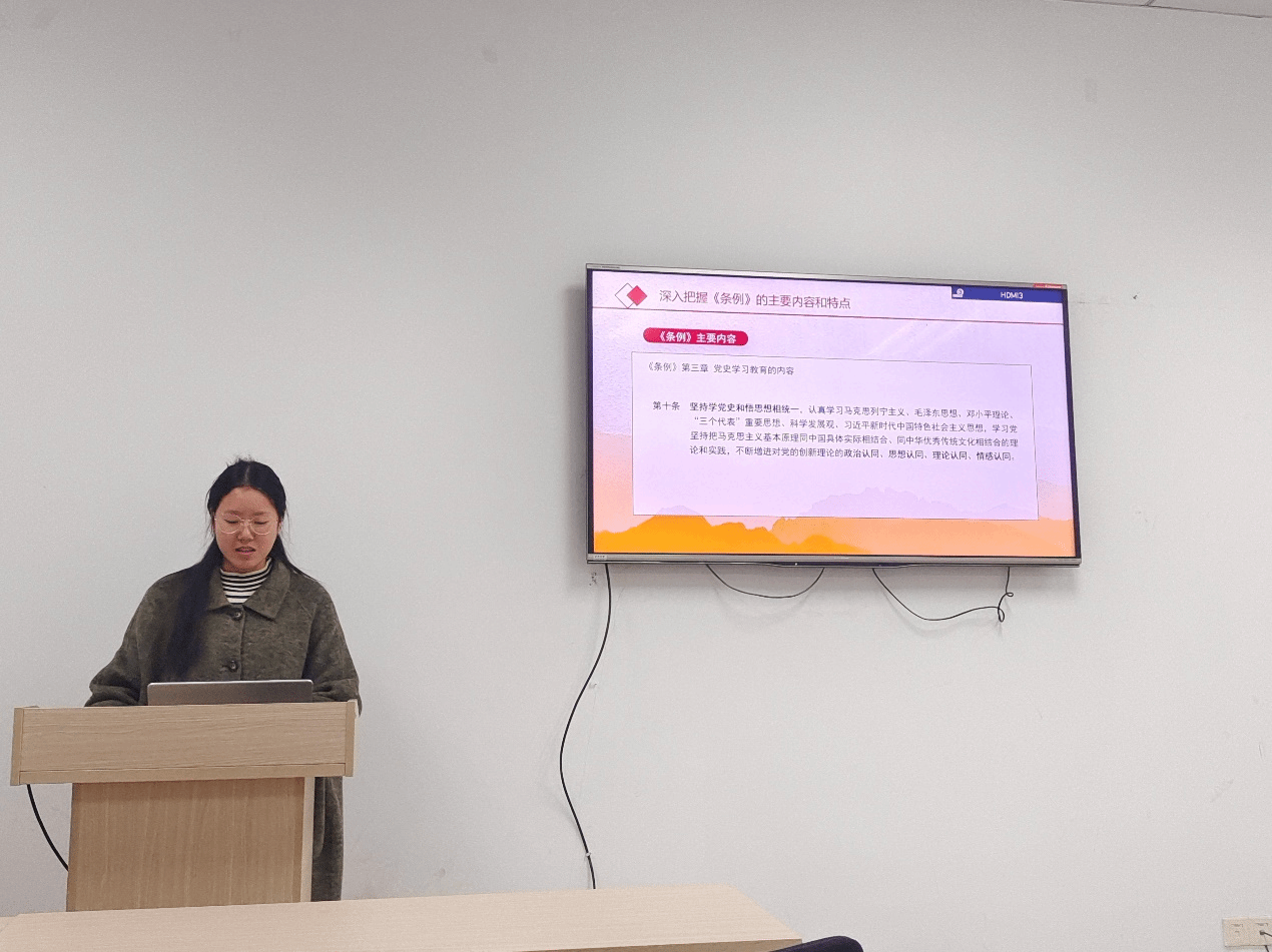 活动伊始,党支部书记王梦梦同志带领同志们《党史学习教育工作条例》,她强调,《党史学习教育工作条例》的颁布实施,对于推动全党全社会深入学好党史、用好党史,从党的辉煌历程中汲取宝贵智慧和力量,具有深远的意义。她要求全体党员要深刻领会条例精神,做到学史明理、学史增信、学史崇德、学史力行,不断提升自身的政治素养和党性修养。