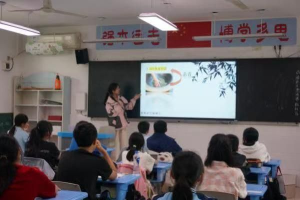 延缓细胞衰老的茶多酚,改善睡眠质量的茶氨酸,增强心血管系统的咖啡碱……这些茶叶的主要内含物质,从多个方面对人体健康产生积极影响。接下来的科学实验环节将气氛推向高潮。翠绿茶汤在试管中魔术般变幻色彩:遇小苏打泛起琥珀光晕,碰白醋绽开晚霞般的玫红。一位小朋友在观察到自己的实验结果后,首先向旁边的同学高兴地分享:“你们看!我的两杯茶水在分别加了小苏打溶液和白醋之后真的变色了!”最后,一份又一份实验成功的喜悦洋溢在七年级三班的教室。