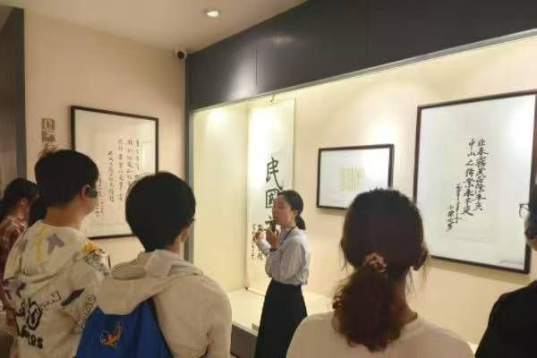社会实践团队首先进入的展馆是“名人名宗”馆,这个展馆里面陈列的是开馆以来,国家领导人们留下的文图资料,其中不乏一些书法作品。而细心的园林2301班曾研同学却发现了其中一幅书法作品的端倪。该作品中题有“民国之门”四个大字。然而奇怪的是 “民”字的弯钩却伸出了头。“这难道是错别字吗?”曾研同学提出疑问,讲解员摇头表示这并不是错别字。原来这幅书法作品是孙中山先生之孙孙治强在参观纪念馆时所题,“民”字之所以要出头,是寓意着“人民出头”,这是武昌首义打响新民主主义革命第一枪后,民众对于民主胜利的象征性表达。听了讲解员的解释团队中的同学更加深刻地意识到了武昌起义在推翻封建帝制中的重要意义。